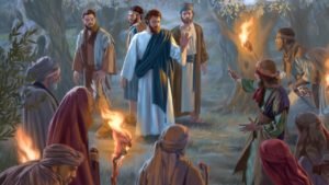 E ele orou assim: “Pai, tudo Te é possível! Afasta de mim este cálice! Contudo, não seja feita a minha vontade, mas sim a Tua!” Os discípulos nem o conseguiram confortar, pois dormiram. E Ele estava só. Por três vezes foram por Jesus acordados, mas dormiram novamente. Deus então, enviou anjos para o consolarem. E na terceira vez que acordou os discípulos, foi para dizer: “O Filho do Homem está sendo entregue aos pecadores! O traidor se aproxima”