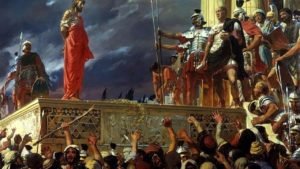 Ainda amarrado, foi levado ao palácio de Pilatos e depois de outro interrogatório, a mesma multidão que o recebera na porta da cidade gritando “Hosana!”… agora ao ver as chicotadas que Ele recebia, gritavam: “Crucifica-O! Crucifica-O!”